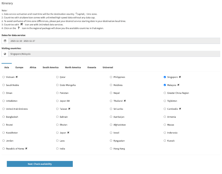 Then you can select either all the dates if just one country, or if traveling to multiple, click on the boxes for the date you are on that country. Remember, if you need data in two different countries, tick both boxes, you only pay for the more expensive of the two.